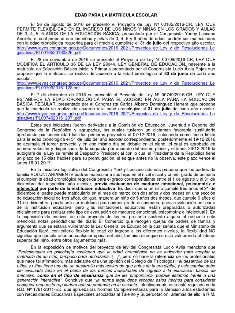 | El Congreso de la República no puede legislar sobre aspectos técnico pedagógicos, recogiendo solo el clamor de un sector de la población sin ningún argumento científico, eso es función del MINEDU y precisamente en base a la sexta disposición complementaria y transitoria de la Ley Nº 28044, Ley General de Educación, que a la letra especifica: "El Ministerio de Educación fijará, con criterio flexible la edad de ingreso a los diferentes niveles de la educación básica, previa evaluación, (…)" lo está haciendo y al decir previa evaluación, no se refiere a la evaluación de cada niño sino que evalúa en base a estudios para poder establecer la edad de ingreso del niño al sistema educativo. | ||